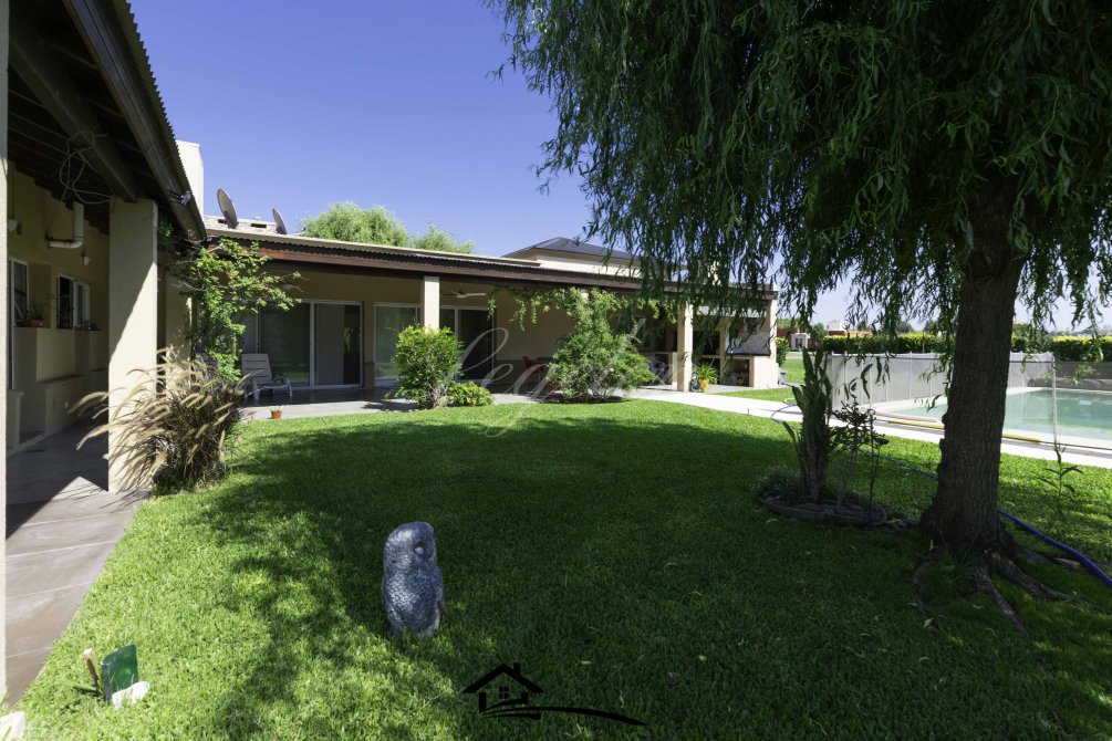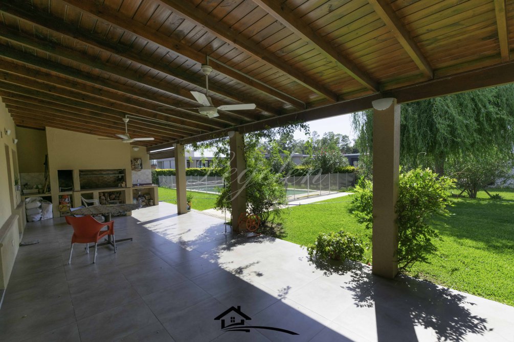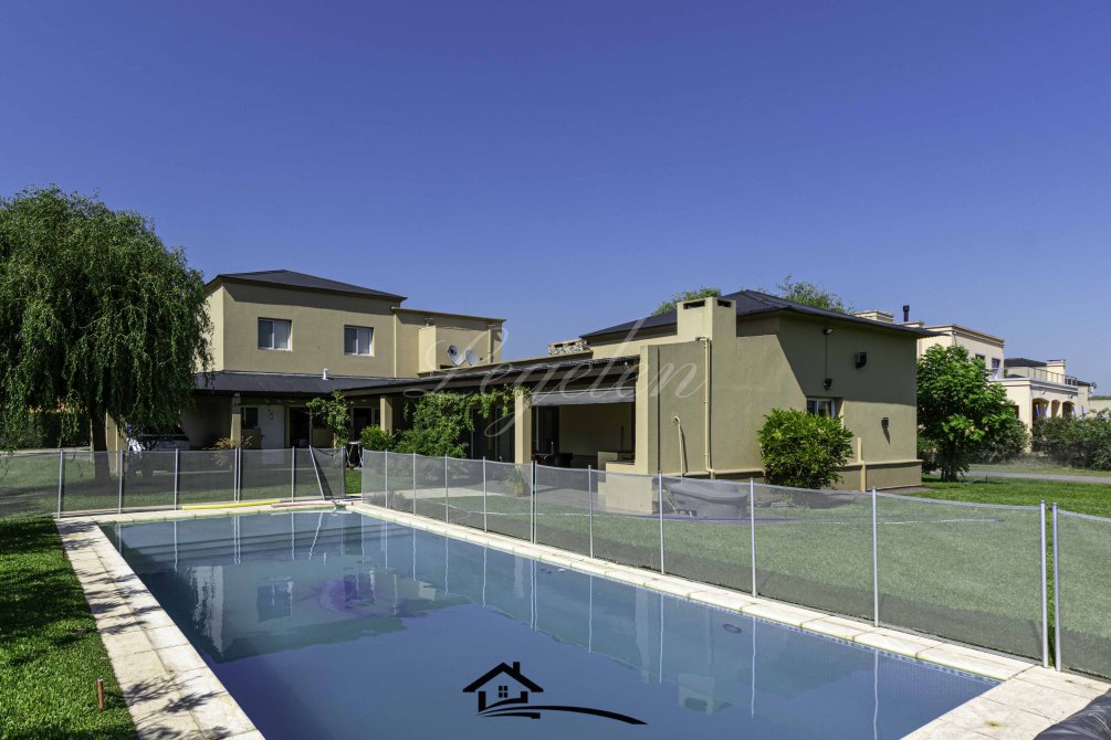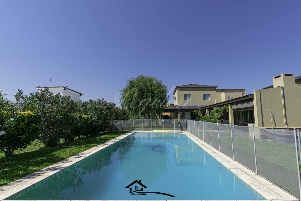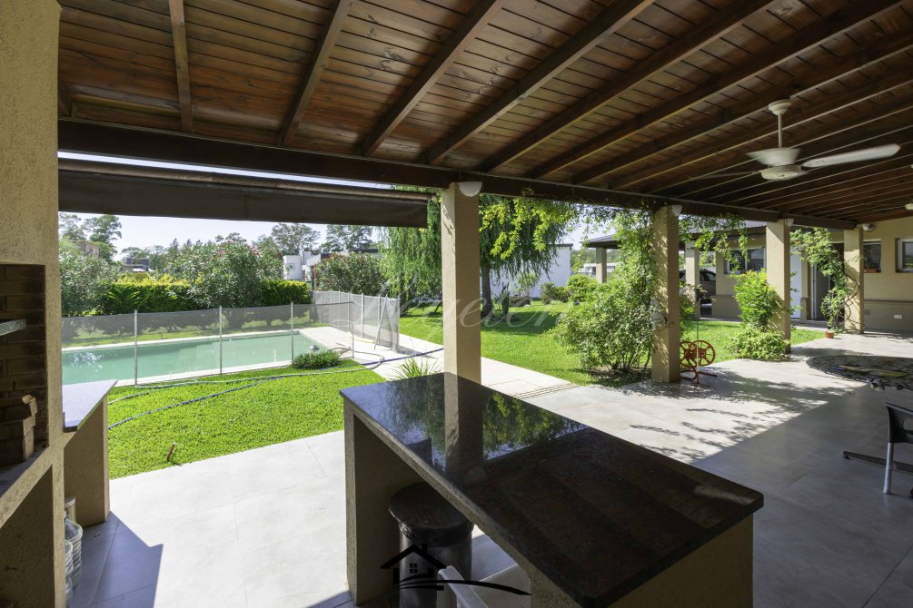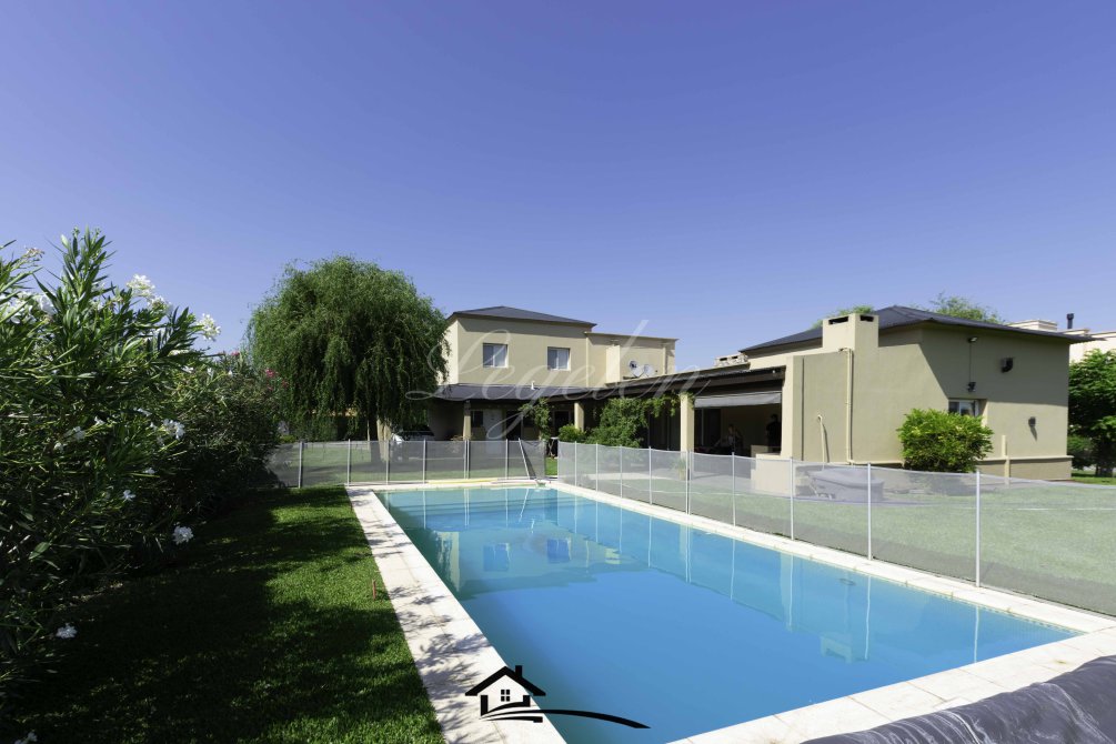 Garaje para 2 autos, quincho con parrilla y con isla-mesada, espacio de guardado, lavadero, baño completo con 2 duchas, 2 bachas con espejo, hermoso jardín con cerco de plantas y piscina climatizada de 32 m2.